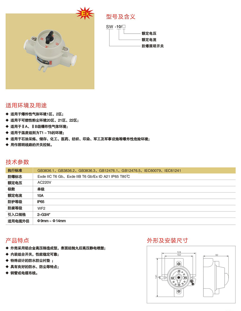 產(chǎn)品中心 防爆配電箱、電器管件類 SW-10系列防爆照明開關(guān)(IIB、IIC)